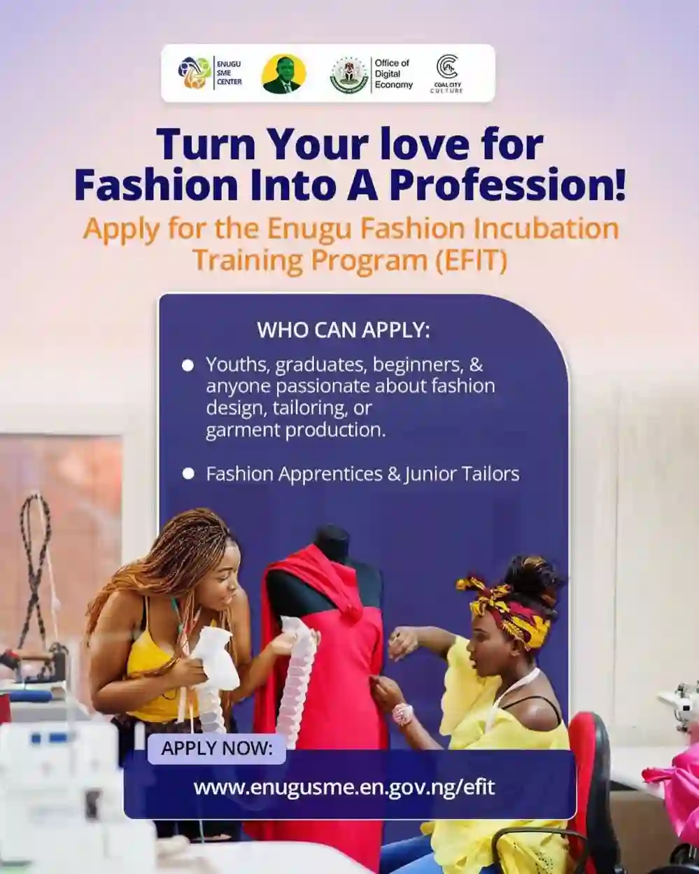 The Enugu State Government, through the Enugu SME Center, has announced the opening of applications for the Enugu Fashion Incubation Training Program (EFIT) in partnership with the Enugu Fashion & Garment Hub. The initiative aims to nurture young fashion talents and turn their creativity into professional skills and sustainable enterprises.