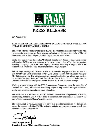 FAAN stated that the development comes after months of stakeholder engagement. According to Mr. Lekan Thomas, Director of Cargo Development and Services, and Mr. Olatokubo Arewa, Airport Manager, the move is designed to improve accountability in the cargo sector.