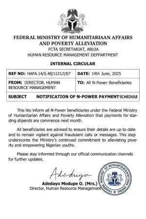 A fake internal circular claiming to be from the Federal Ministry of Humanitarian Affairs and Poverty Alleviation is currently circulating widely on Facebook, causing confusion among many Nigerians. The poorly written document, which carries several spelling errors and fake formatting, falsely announces a new N-Power payment schedule.