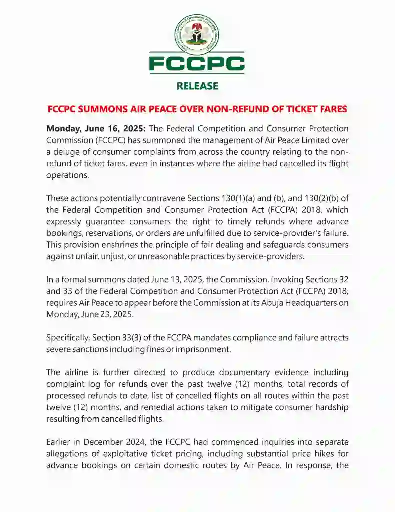June 16, 2025 – The Federal Competition and Consumer Protection Commission (FCCPC) has officially summoned Air Peace Limited following a surge in complaints from Nigerian airline passengers over non-refunded ticket fares, even in cases where the airline itself cancelled flight operations.