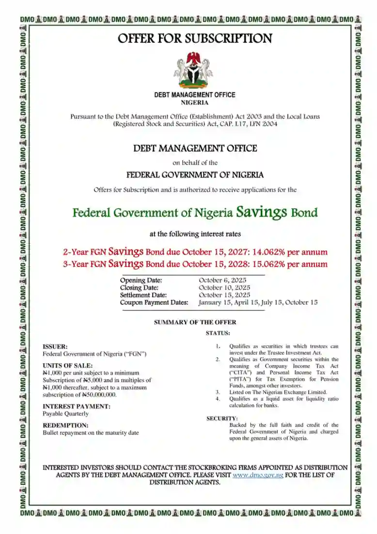 According to the DMO, the offer includes a 2-Year FGN Savings Bond due October 15, 2027, at an interest rate of 14.062% per annum, and a 3-Year FGN Savings Bond due October 15, 2028, at an interest rate of 15.062% per annum. The opening date for the offer is October 6, 2025, while the closing date is October 10, 2025. The settlement date is scheduled for October 15, 2025, with coupon payment dates set for January 15, April 15, July 15, and October 15.