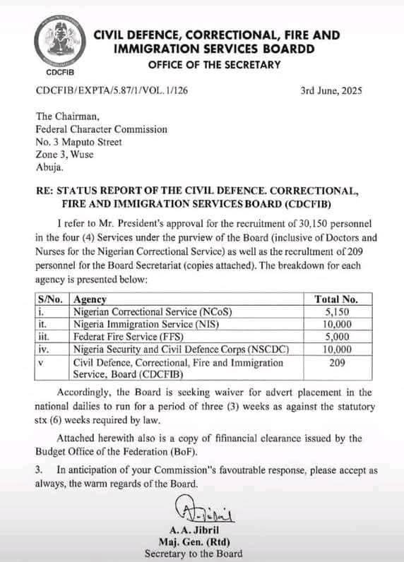 In the circular, titled “Status Report of the Civil Defence, Correctional, Fire and Immigration Services Board,” the Board confirmed President Muhammadu Buhari’s approval for the recruitment of 30,150 personnel across four agencies, alongside 209 staff for the Board’s Secretariat.