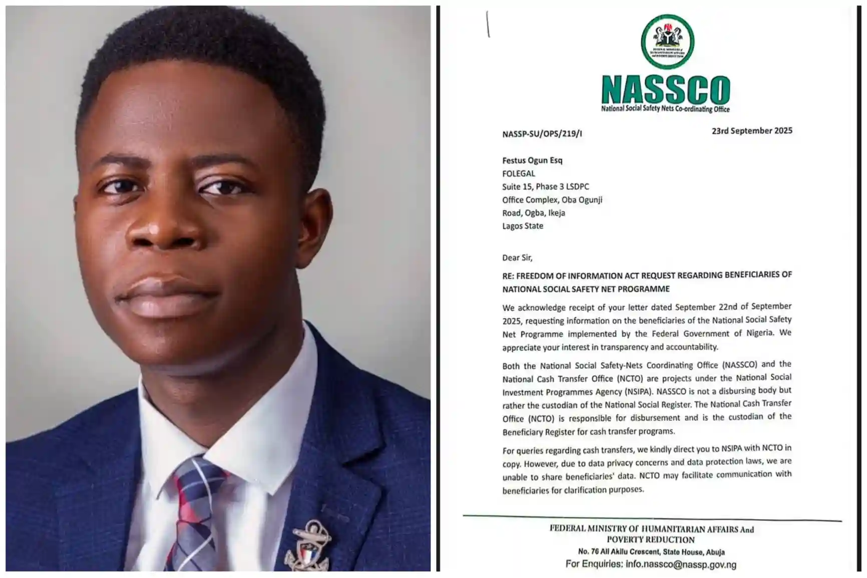 Following the announcement, human rights lawyer Festus Ogun submitted a Freedom of Information (FOI) request on September 22, 2025, demanding full disclosure of beneficiaries. His request sought details including names, disbursement dates, amounts received, and the states of residence of those listed as beneficiaries.