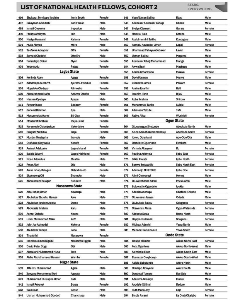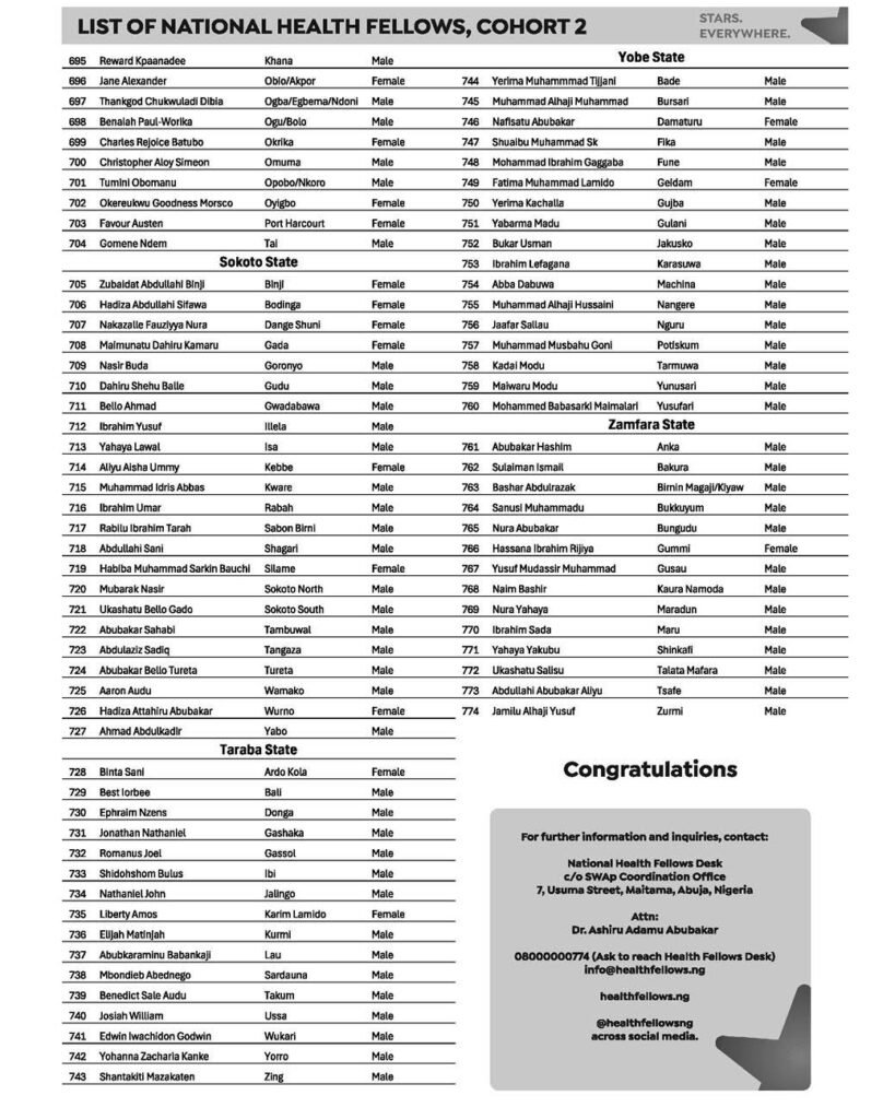 The federal government has released the full list of 774 National Health Fellows selected from across the Federation, marking a major step in efforts to strengthen Nigeria’s health system through young professionals.