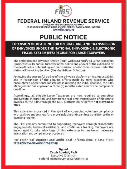 August 11, 2025 – The Federal Inland Revenue Service (FIRS) has announced a three-month extension for the onboarding and transmission of electronic invoices under the National E-Invoicing and Electronic Fiscal System (EFS) regime. The extension applies to large taxpayers, defined as businesses with an annual turnover of five billion naira and above.