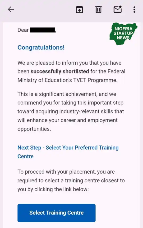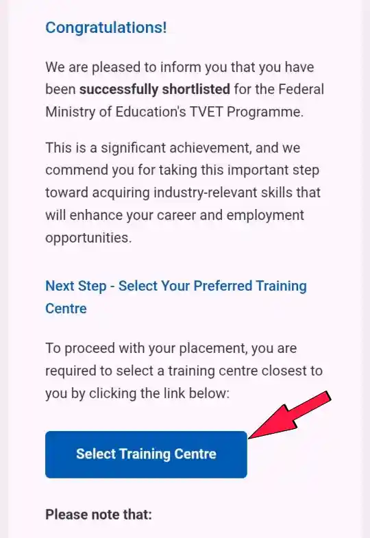 “Dear Candidate, we are pleased to inform you that you have been successfully shortlisted for the Federal Ministry of Education’s TVET Programme.”