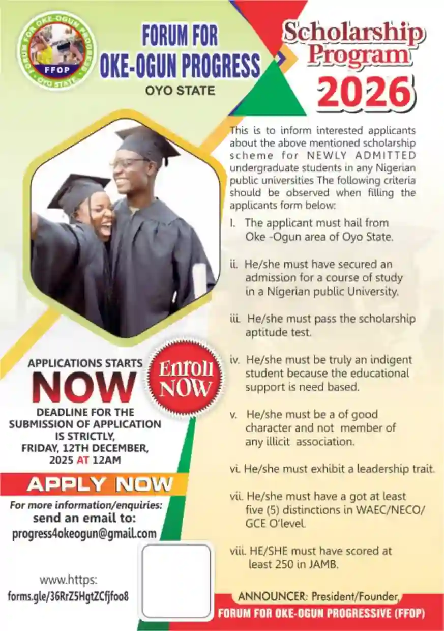 According to the organizers, the scholarship is designed to promote educational access and empower bright but financially challenged students. “This scheme represents our commitment to investing in the next generation of leaders from Oke-Ogun. Only genuine and deserving students from public universities will be considered,” the FFOP stated.