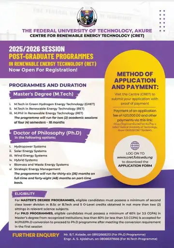 The Federal University of Technology, Akure (FUTA), through its Centre for Renewable Energy Technology (CRET), has officially opened applications for its 2025/2026 postgraduate programmes in Renewable Energy Technology (RET).