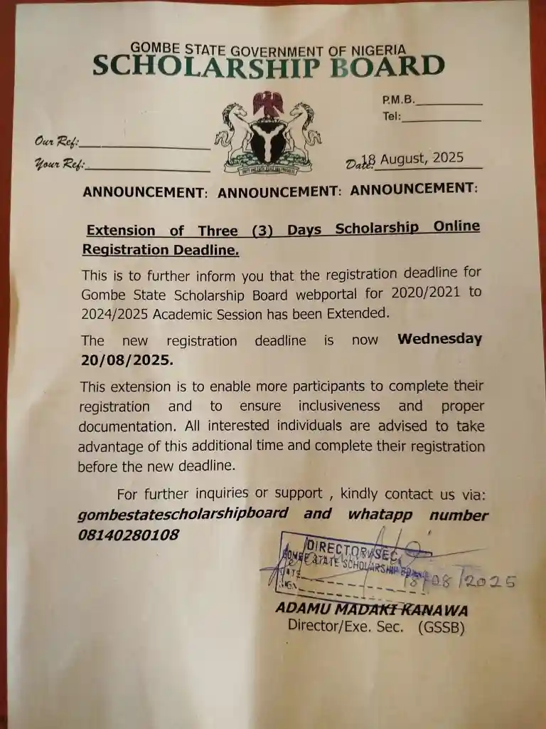 August 18, 2025 – The Gombe State Government of Nigeria has announced an extension of the online registration deadline for its scholarship programme.
