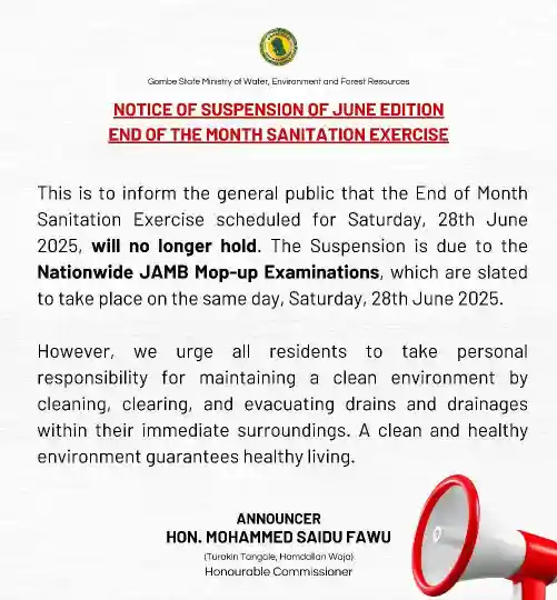 June 26, 2025 – The Gombe State Ministry of Water, Environment and Forest Resources has announced the suspension of the June edition of the monthly sanitation exercise. This was confirmed in an official statement released by the Honourable Commissioner, Hon. Mohammed Saidu Fawu.