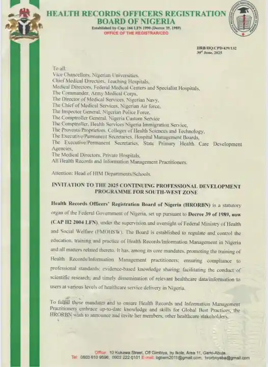 The Health Records Officers Registration Board of Nigeria (HRORBN) has officially announced the 2025 Continuing Professional Development (CPD) Programme for the South-West Zone, inviting health records and information management professionals from across the region to attend. This event is set to strengthen skills, ensure up-to-date training, and promote global best practices in health data management.