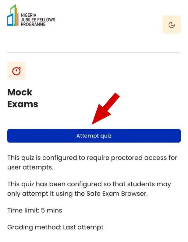 Step 4: Click on “Login with njfp.ng”. This will take you to either the quiz or the exam you want to write.