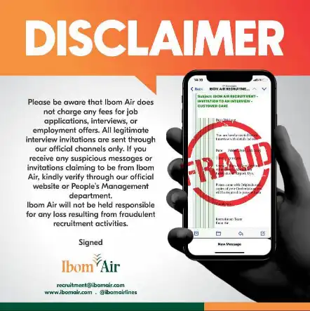 Ibom Air stressed that it “will not be held responsible for any loss resulting from fraudulent recruitment activities.” For enquiries, contact recruitment@ibomair.com.