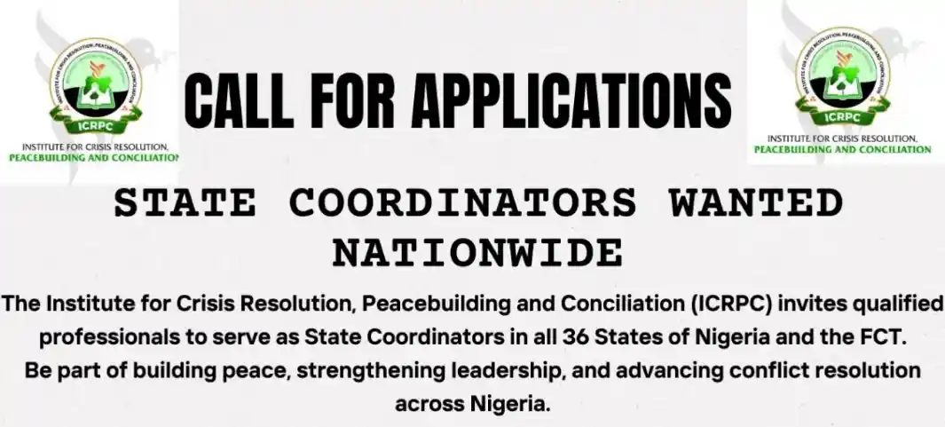 The Institute for Crisis Resolution, Peacebuilding and Conciliation (ICRPC) invites qualified professionals to serve as State Coordinators across all 36 states of Nigeria and the FCT.