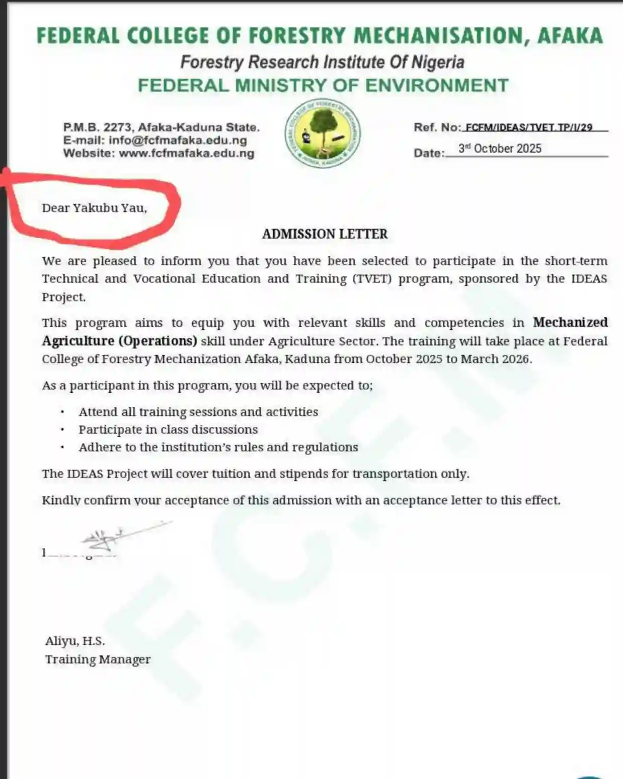 TVET by IDEAS has officially begun sending admission letters to successful trainees across the country. The letters, which carry details of the training institutions and specific skill types, are now reaching selected candidates. One of the institutions involved is the Federal College of Forestry Mechanisation, Afaka, under the Forestry Research Institute of Nigeria and the Federal Ministry of Environment.