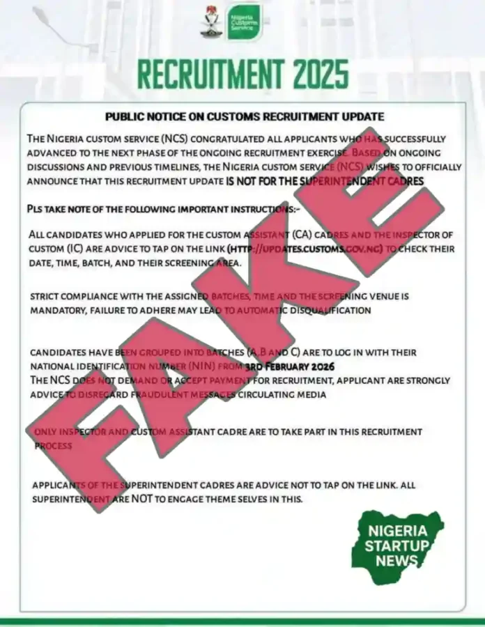 There is an ongoing false claim on social media that the Nigeria Customs Service (NCS) has released screening details for the Customs Assistant (CA) and Inspector of Customs (IC) cadres, including date, time, batch, and venue. Nigeria Startup News can confirm that the information being circulated is not genuine and has been doctored by fake news mongers targeting recruitment applicants.