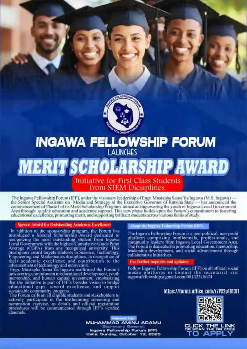 The Ingawa Fellowship Forum (IFF) has announced the commencement of the Phase I Merit Scholarship Program aimed at empowering youths of Ingawa Local Government Area through quality education and academic support. The program, led by Engr. Mustapha Sama’ila Ingawa (M.S. Ingawa), Senior Special Assistant on Media and Strategy to the Executive Governor of Katsina State, is designed to reward excellence and promote higher learning among young scholars.