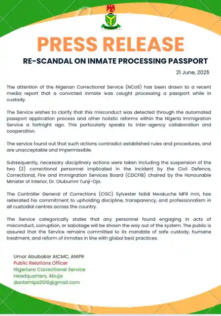 The Nigerian Correctional Service (NCOS) has addressed reports claiming a convicted inmate processed an international passport while in custody. According to a press release dated 21 June 2025, the Service clarified that the misconduct was discovered through the Nigeria Immigration Service’s automated passport system.