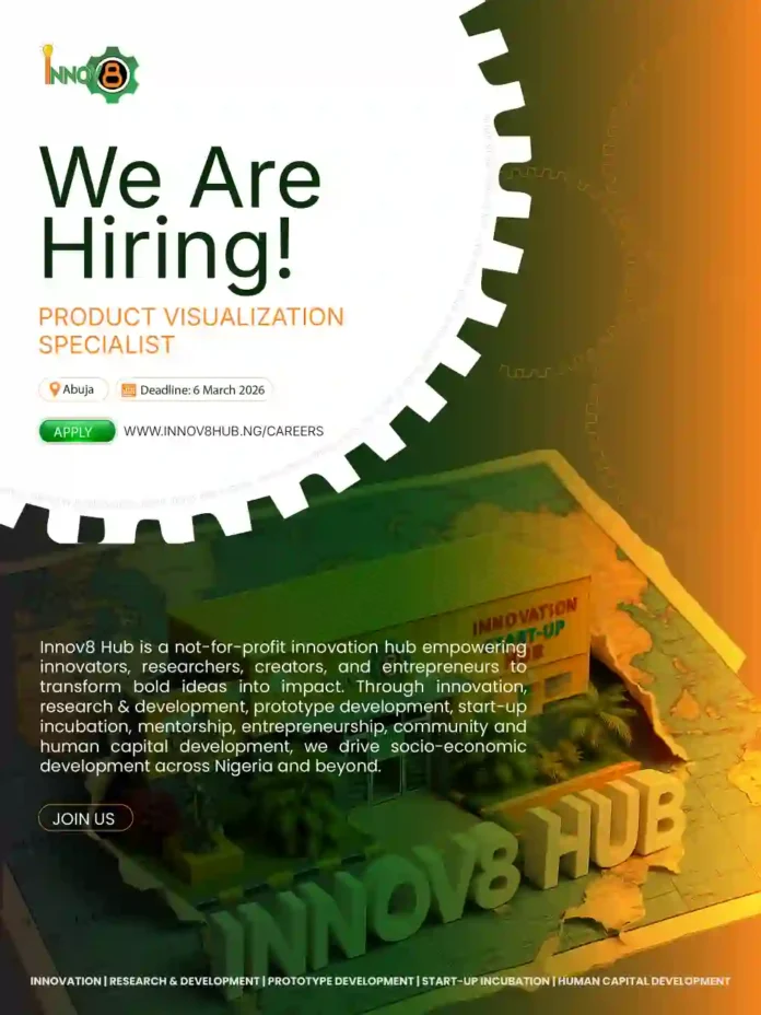 Innov8 Hub has announced that it is hiring a Product Visualization Specialist to support its growing innovation and research activities in Nigeria.