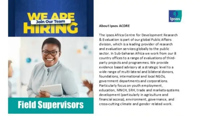 Ipsos Africa Centre for Development Research & Evaluation has announced the recruitment of Field Supervisors to support its research and evaluation projects across Sub-Saharan Africa. This opportunity is aimed at experienced professionals who can lead field activities, ensure data quality, and contribute to impactful development research across the region.
