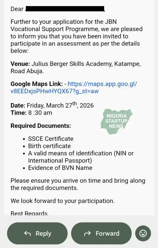 Julius Berger Nigeria (JBN) Plc has invited shortlisted candidates for an assessment under its Vocational Support Programme, with notifications sent directly via email.