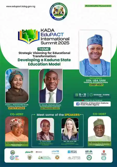 Kaduna State is taking a bold step towards educational reform with the KADA EduPACT International Summit 2025, themed “Strategic Visioning for Educational Transformation: Developing a Kaduna State Education Model.” The summit is scheduled for 9th – 11th July 2025, from 9:00 AM to 5:00 PM daily.