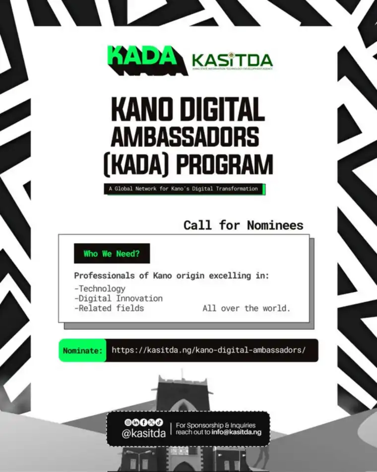 Nominations are open to professionals of Kano origin excelling in technology, digital innovation, and related fields. Deadline is to be announced, while applications can be submitted via https://kasitda.ng/kano-digital-ambassadors/.