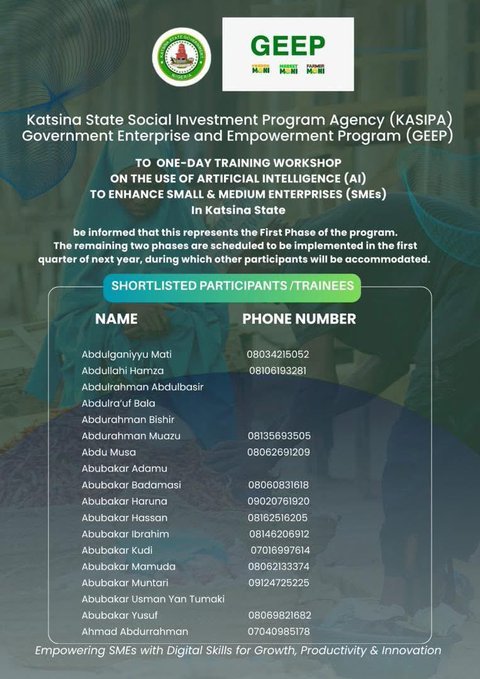 Katsina State Social Investment Program Agency (KASIPA) has commenced a one-day training workshop under the Government Enterprise and Empowerment Program (GEEP) on the use of Artificial Intelligence (AI) to enhance Small and Medium Enterprises (SMEs) in Katsina State.