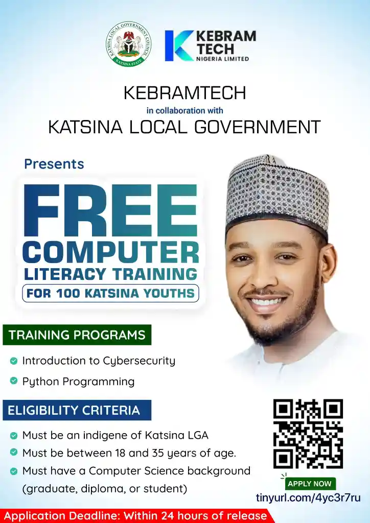 KebramTech, in collaboration with Katsina Local Government, has announced 100 free training slots for youths in Katsina Local Government Area. According to the organizers, 50 slots are available in Cybersecurity and 50 slots in Python Programming.
