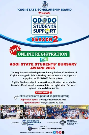 Kogi State Scholarship Board has announced the launch of Governor Ododo Students Support Season 2, opening the free online registration for the 2025 Bursary Award. The Board stated that the initiative is to support students of Kogi State origin in public tertiary institutions across Nigeria.