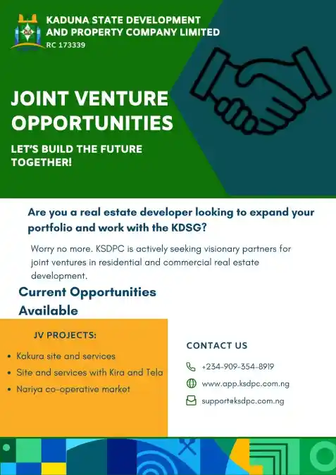 “Are you a real estate developer with big plans? Worry no more,” the company said in its latest announcement. The Kaduna-based agency is offering current opportunities for collaboration through joint venture projects.