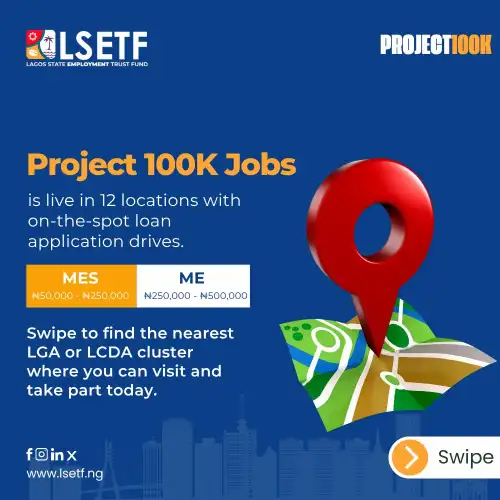 August 11, 2025 – The Lagos State Employment Trust Fund has announced that Project 100K Jobs is now active across 12 locations in Lagos, offering residents direct access to funding opportunities for their businesses.