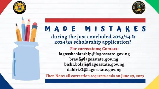 The Lagos State Scholarship Board has announced that students who made mistakes during the 2023/2024 and 2024/2025 scholarship applications can now correct them.