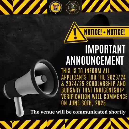 The Lagos State Scholarship Board has issued an important update for applicants. In a notification titled “Notice! Notice! Important Announcement”, the board stated, “This is to inform all applicants for the 2023/24 and 2024/25 scholarship and bursary that indigeneship verification will commence on June 30th, 2025.” The venue will be communicated soon.