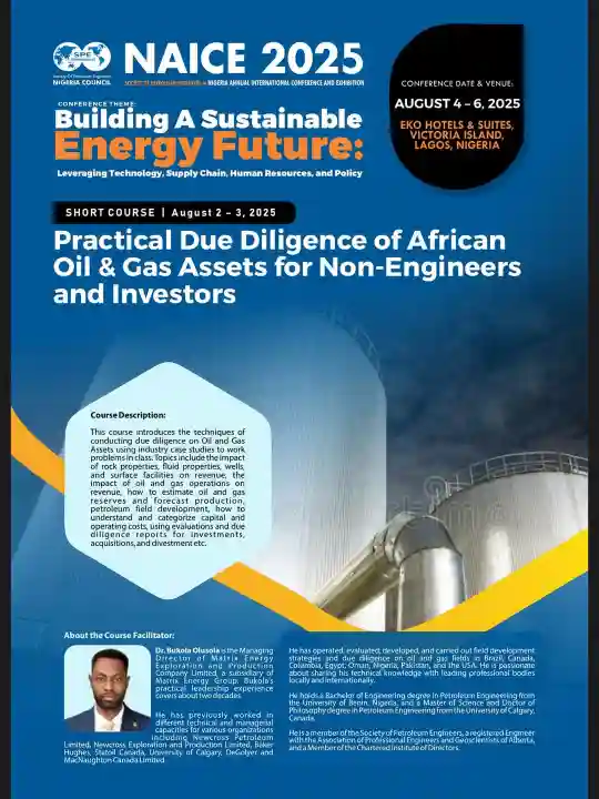 The course is titled “Practical Due Diligence of African Oil & Gas Assets for Non-Engineers and Investors” scheduled for August 2–3, 2025, at Eko Hotels & Suites in Victoria Island, Lagos.