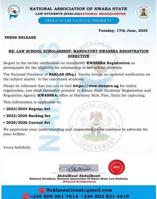 In a press release dated Tuesday, June 17, 2025, the president stated, “Sequel to the earlier notification on mandatory KWASSRA Registration as prerequisite for the eligibility for scholarship to law school students, the National President of NAKLAS (Nhq.) hereby brings an updated notification on the subject matter to the concerned students.”