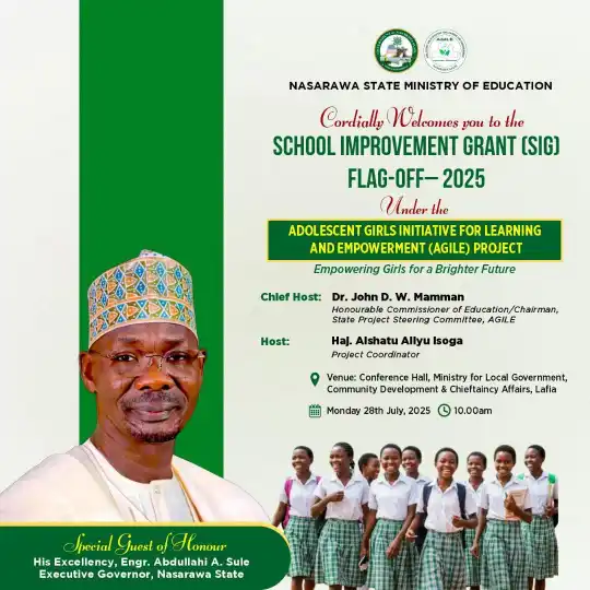 On July 28, 2025, the Nasarawa State Government will launch a $9.735 million School Improvement Grant (SIG) for public secondary schools. The initiative is in partnership with the AGILE (Adolescent Girls Initiative for Learning and Empowerment) Nasarawa project and will be unveiled at the Aliyu Akwe Banquet Hall, Government House in Lafia.