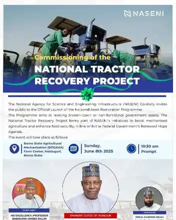 The National Agency for Science and Engineering Infrastructure (NASENI) has announced the commissioning of the National Tractor Recovery Project under its National Asset Restoration Programme. The launch is scheduled for Sunday, June 8th, 2025, at 10:30 am. It will take place at the Borno State Agricultural Mechanization (BOSAMA) Farm Center in Maiduguri.