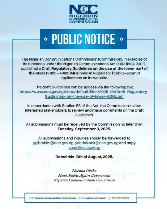 A statement from the Commission reads, “The draft Guidelines can be accessed via the following link: https://www.ncc.gov.ng/sites/default/files/2025-08/Draft-Regulatory-Guidelines-on-the-use-of-lower-6GHz.pdf.”