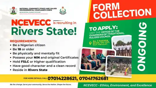 The National Community Ethics and Values Environmental Compliance Corps (NCEVECC) has announced that recruitment is still ongoing for interested applicants in Rivers State.