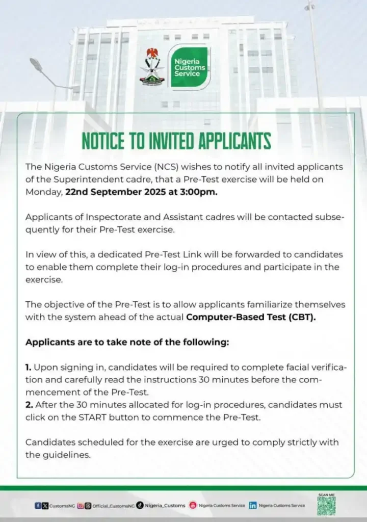 September 18, 2025 – The Nigeria Customs Service (NCS) has announced that all invited applicants of the Superintendent cadre are to take part in a Pre-Test exercise scheduled for Monday, 22nd September 2025 at 3:00pm.