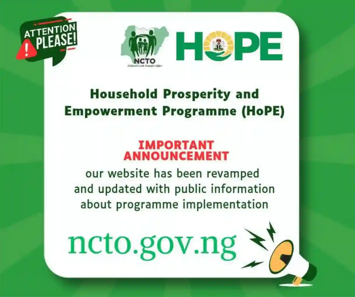 The National Cash Transfer Office (NCTO) has announced the launch of its newly revamped Household Prosperity and Empowerment Programme (HoPE) website. According to the agency, the new platform serves as the official and verified source of information about the HoPE initiative, which aims to improve the livelihood and economic well-being of households across Nigeria through targeted empowerment and support.