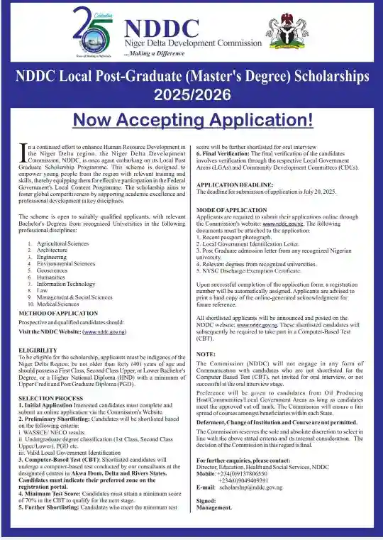 The Niger Delta Development Commission (NDDC) has officially opened applications for its 2025/2026 Local Master’s Postgraduate Scholarship Programme. The scheme is targeted at qualified indigenes of the Niger Delta region to pursue Master’s degree studies in accredited Nigerian universities.