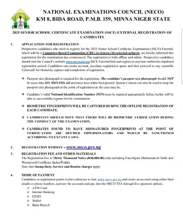 In a public statement signed by Professor Dantani Ibrahim Wushishi, the Registrar and Chief Executive of NECO, the Council detailed every step candidates must follow to successfully register, stating, “Prospective candidates are advised to register at any time within the stipulated registration period through the Council’s website at www.neco.gov.ng via the SSCE External link.”