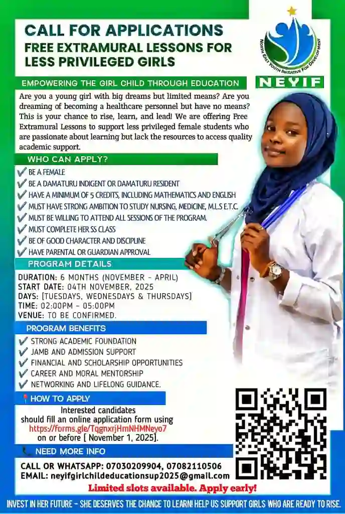 North Youth Initiative for Development (NEYIF) has announced the opening of its 2025 Girl-Child Education Support program aimed at empowering less privileged girls through education. The initiative, titled “NEYIF Girl-Child Education Support 2025,” offers free extramural lessons for young female students who have dreams of pursuing careers in healthcare and other academic fields.