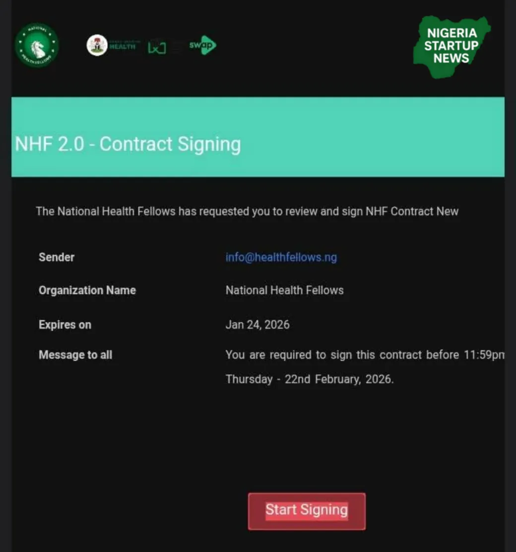 The National Health Fellows 2.0 has sent email notifications requiring all selected fellows to complete their contract signing. Successful fellows have been sent emails containing links for NHF 2.0 contract signing.