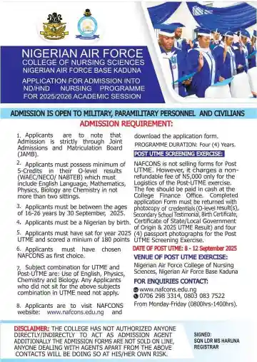 The Post-UTME screening exercise will be held from 8 to 12 September 2025 at the Nigerian Air Force College of Nursing Sciences, Air Force Base Kaduna.