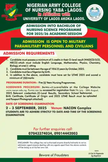 The Nigerian Army College of Nursing, Yaba-Lagos, in affiliation with the University of Lagos (UNILAG) Akoka, has announced the commencement of admission into its Bachelor of Nursing Science (B.NSc.) programme for the 2025/2026 academic session. This opportunity is open to military personnel, paramilitary officers, and civilians, according to a recent notice released by the college.