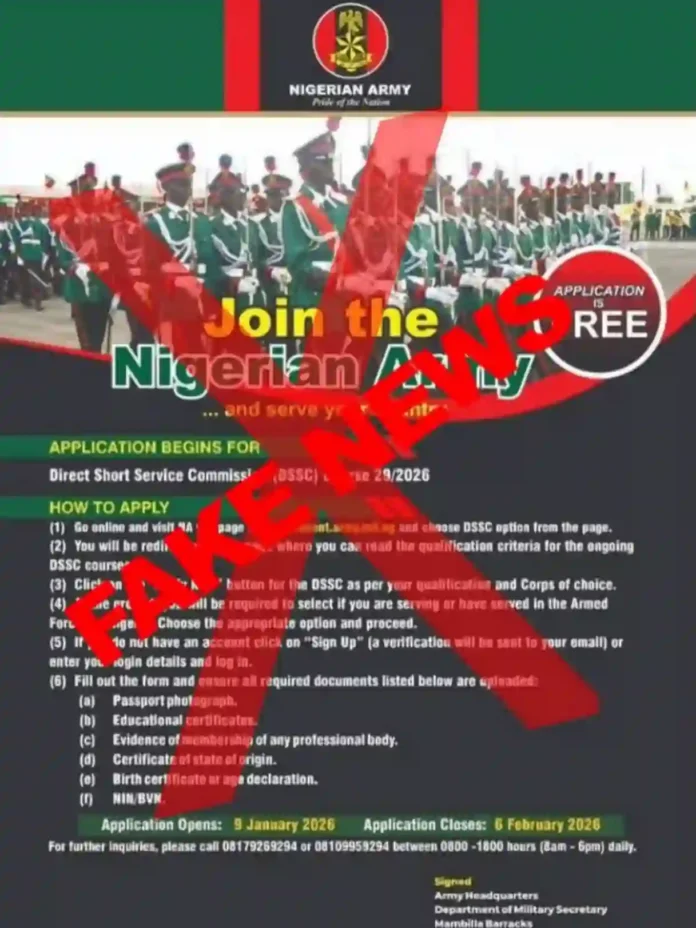 According to the statement, “The attention of the Nigerian Army has been drawn to a recruitment advertisement circulating on social media and other online platforms, falsely informing the public that the ‘Nigerian Army Direct Short Service Course (DSSC) 29 Application Form 2026’ is available. This is fake, false and misleading as no such advertisement was authorized by the Nigerian Army.”