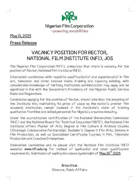 The Nigerian Film Corporation (NFC) has announced a new job opening for the position of Rector at the National Film Institute (NFI), Jos. This is a rare opportunity for qualified professionals in Nigeria’s creative industry.